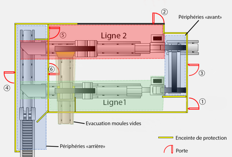 - L'ouverture de la porte 5 provoque l'arrêt des périphéries "arrière" ou de la ligne 2 en fonction de la zone de provenance.