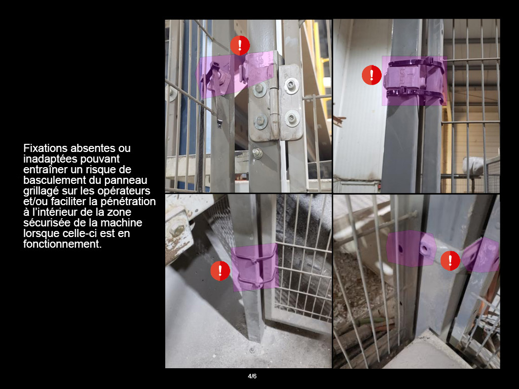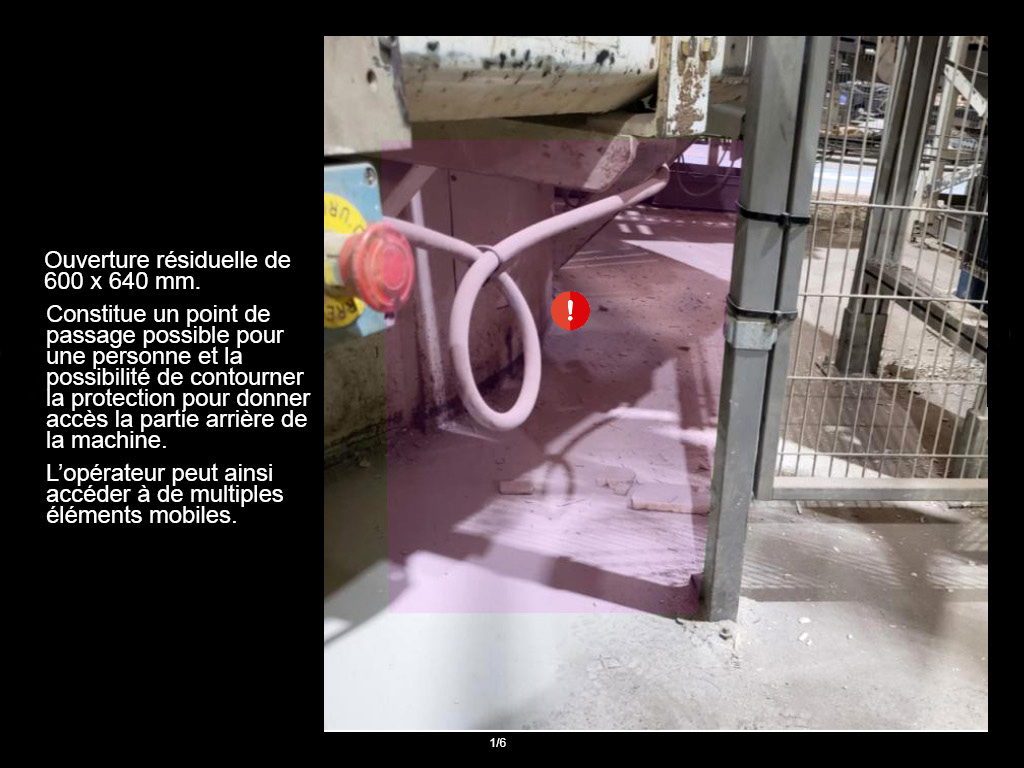 - Accès possible à des éléments mobiles de travail pendant la production du fait de l'absence de protecteurs ou d'ouvertures résiduelles dans les protecteurs.