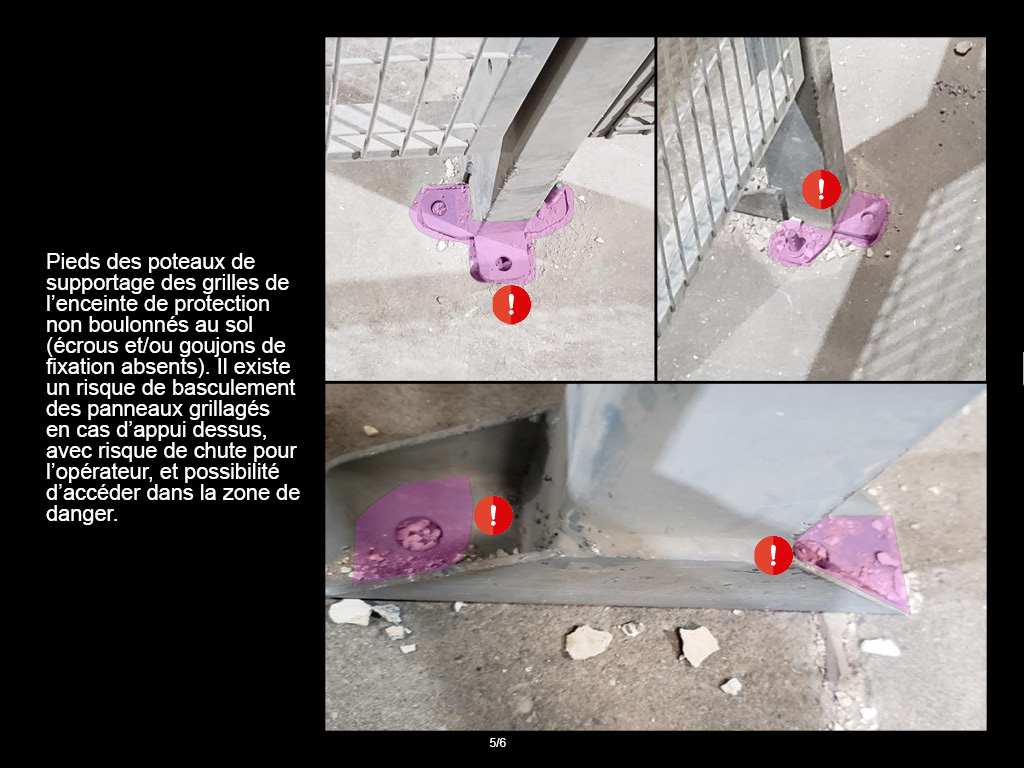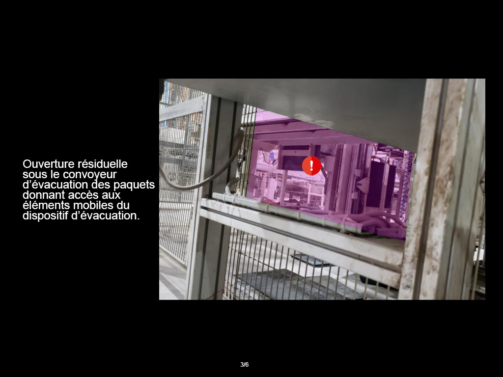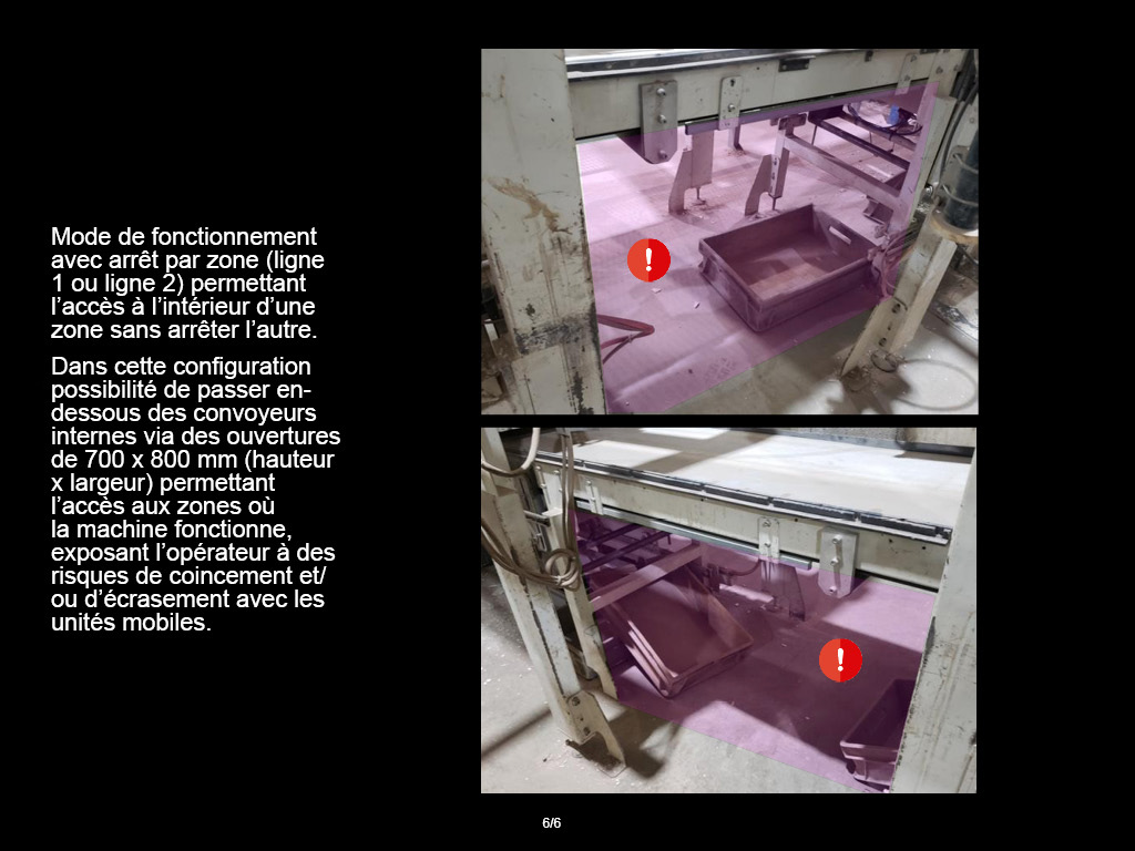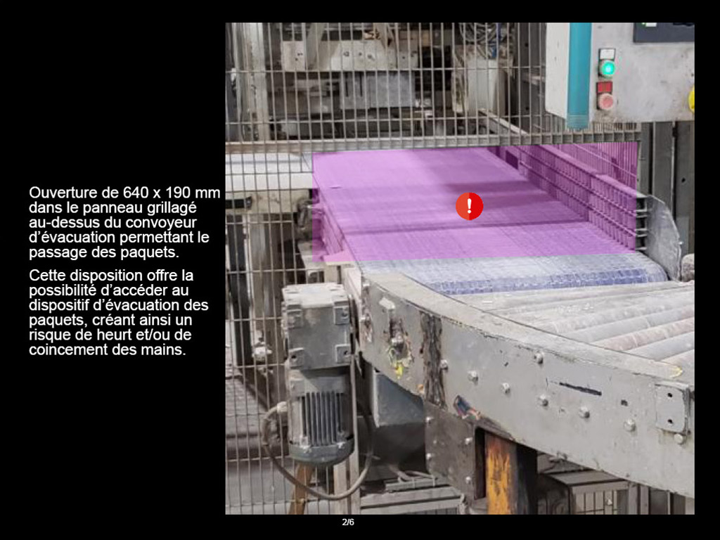 Afin d'avoir une vision exhaustive des points à améliorer, une vérification de l'état de conformité vis-à-vis de la "Directive Machine" a été réalisée par un bureau de contrôle, à la demande de l'Inspection du travail, prenant en compte également les modifications apportées par l'utilisateur ou les dégradations liées à l'usage.